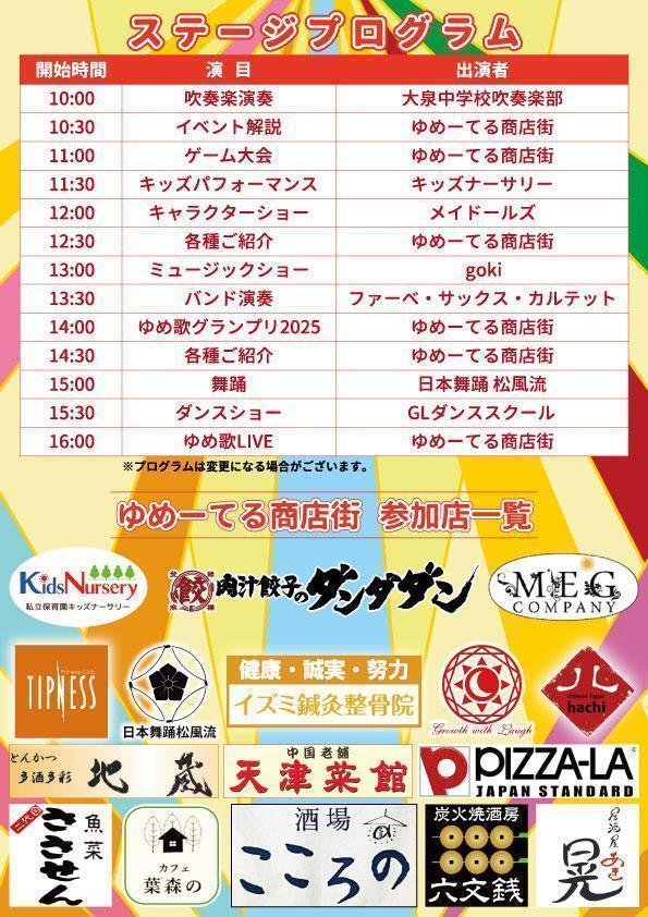 村上もとか先生にご協力頂き、不朽の名作「仁 -JIN-」をテーマに商店街を巡って謎を解き明かす「謎解きウォークラリー」、一般公募したパフォーマーやゆめーてる商店街のダンススクール、区立大泉中吹奏楽部によるステージショー。 ゆめーてる商店街の名店の味が楽しめる露店。「カフェ葉森の」からは「仁 -JIN-」に登場する「プリン」を再現しました。その他、遊び体験や都立大泉高校から防災に関して出店されます。