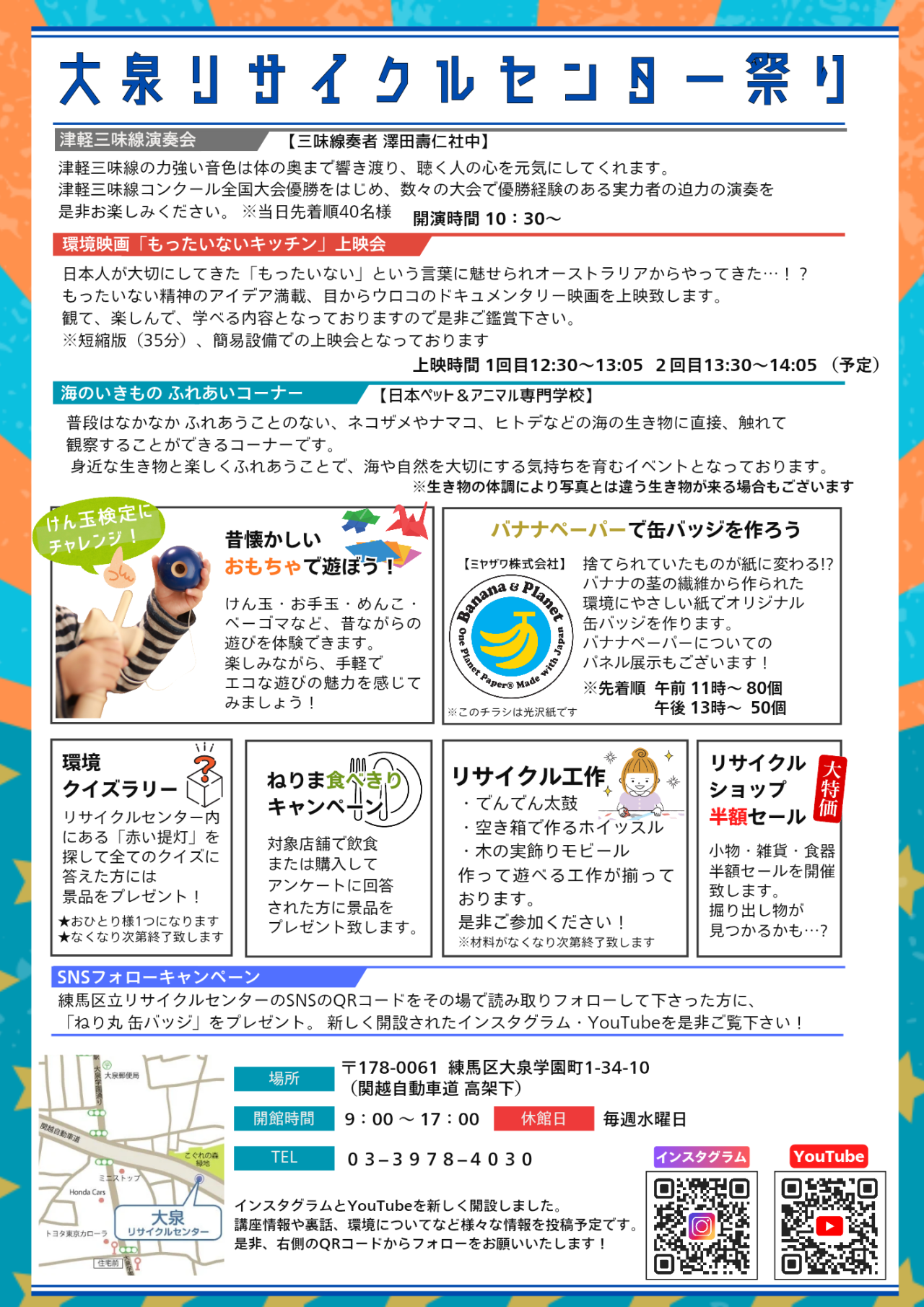 また、今回は澤田壽仁社中津軽三味線演奏会、環境映画「もったいないキッチン」(短縮版。簡易設備上映会)など盛りだくさんのイベントです。