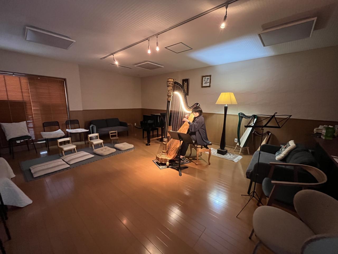 よく響く空間で間近で聴けるヴァイオリンとグランドハープの音色をくつろいでお楽しみください