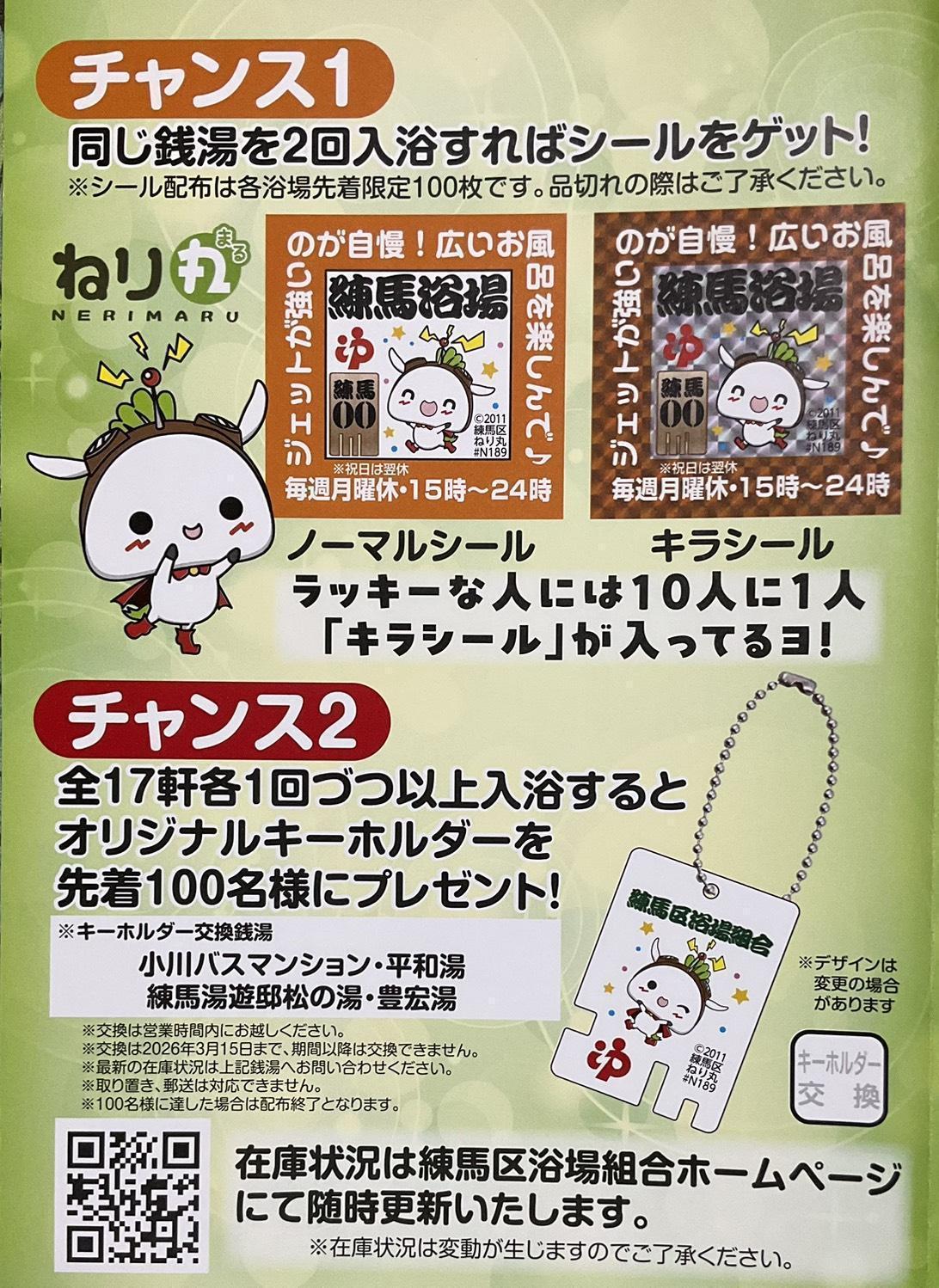 | 備考 | ※キーホルダー交換銭湯 小川バスマンション・平和湯・練馬湯遊邸 松の湯・豊宏湯 |