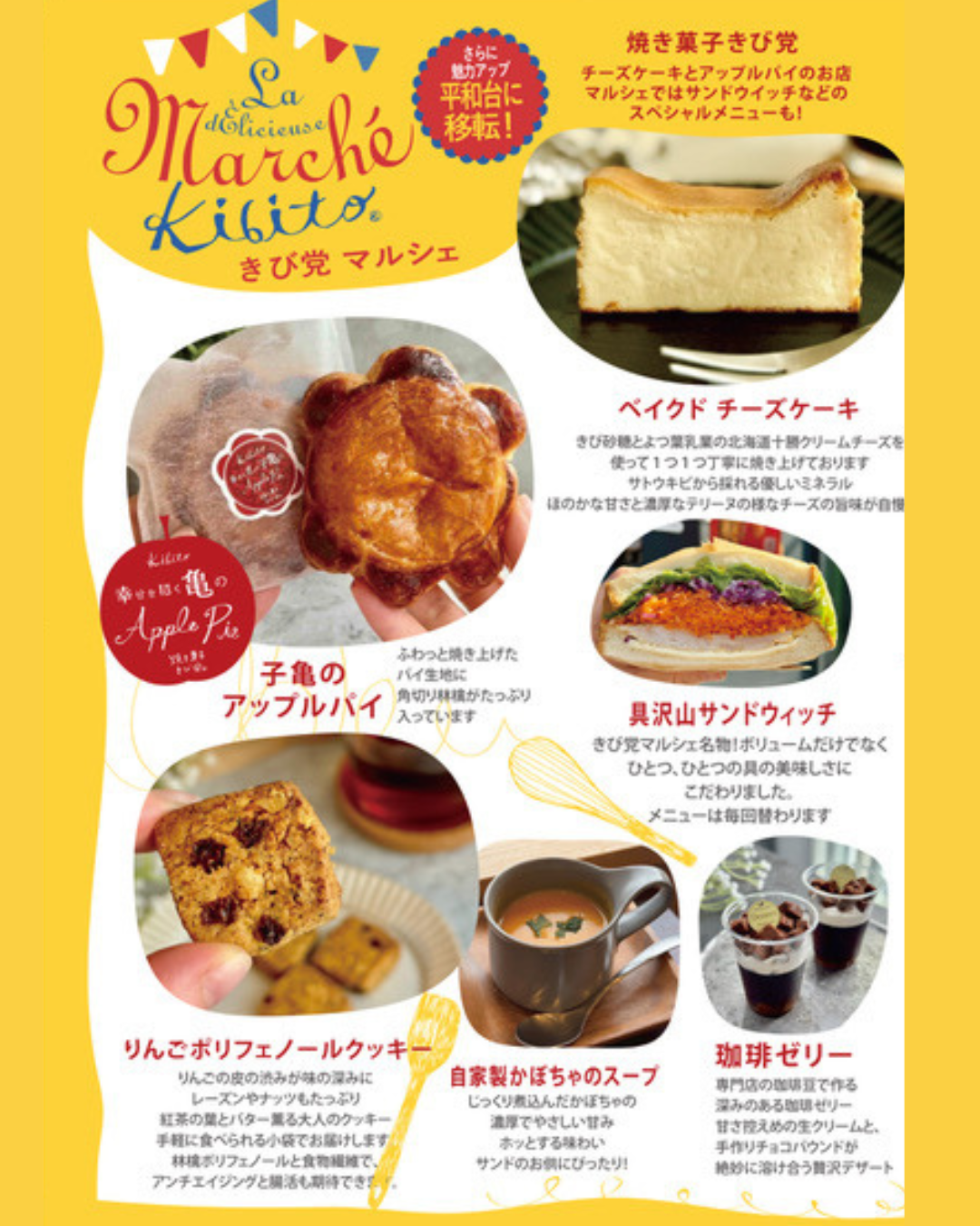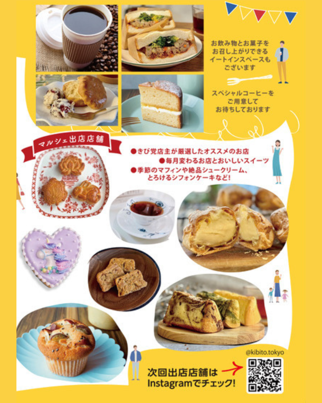 | 備考 | 出店店舗は毎回入れ替わり!きび党のInstagramで次回出店店舗やスケジュールを発表しています。DMからお菓子のお取り置きも可能。ぜひフォローしてご確認ください。Instagram: @kibito.tokyo イートイン(カフェ利用)も可能です。美味しい珈琲や紅茶のほかに、マルシェ名物のサンドイッチなど軽食もご用意しております。 |