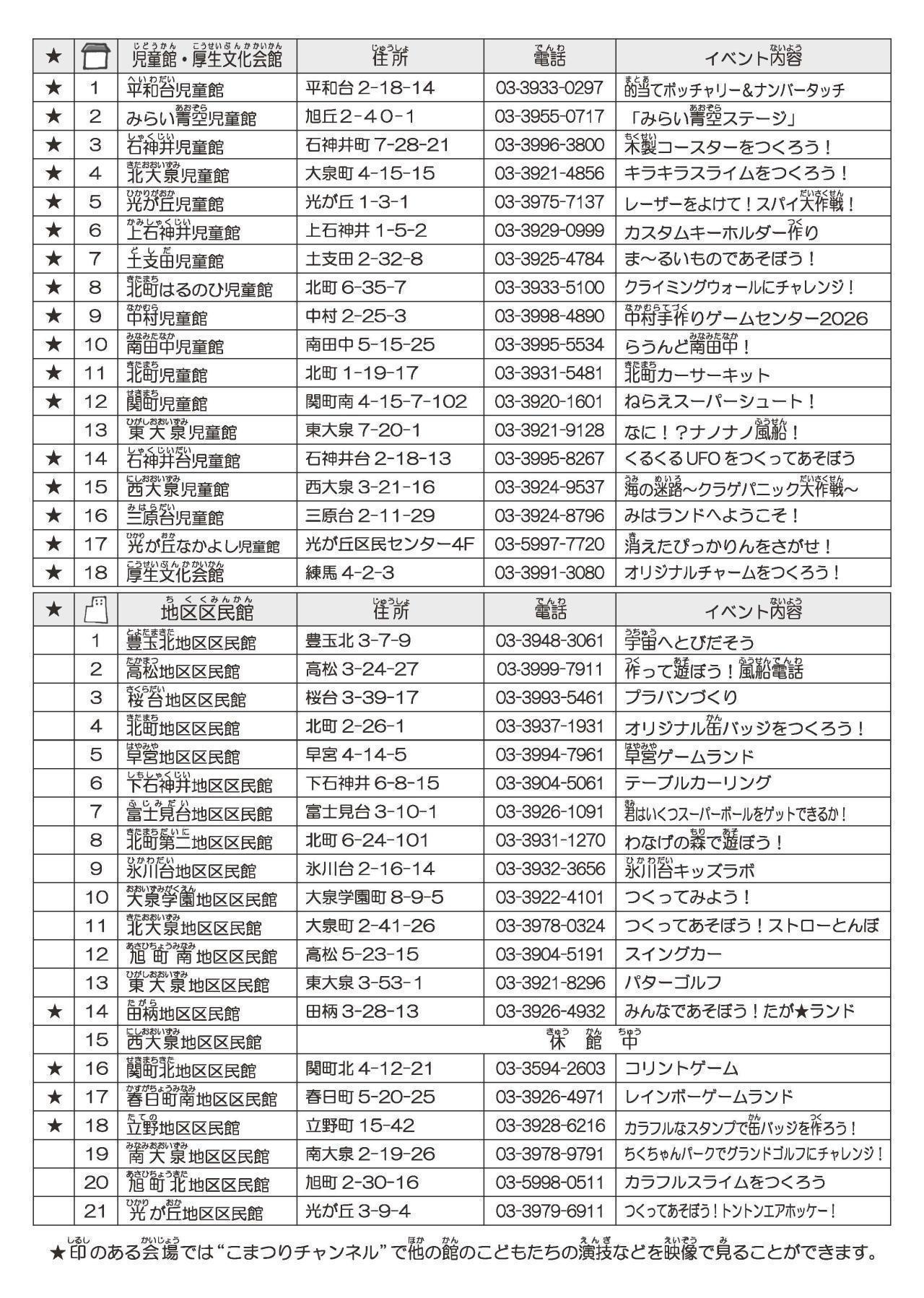 | 場所 | 練馬区内の児童館、厚生文化会館、地区区民館 |