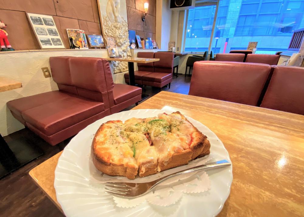 昭和47年創業。細い階段をドキドキしながら昇ると、広々とした空間が。気負わせない雰囲気が魅力。練馬に縁の深い漫画や昭和のプラモデルが多数展示してあり、タイムスリップした気分に。定番ピザトースト(税込720円)はきっと誰もが好きな味。