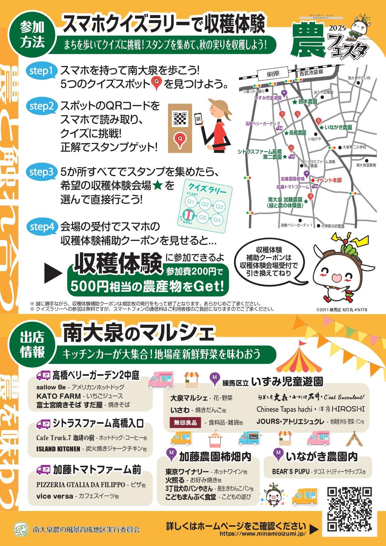 収穫体験ができるクイズラリー、マルシェ、農のフォトアート、お菓子がもらえるガラポンなど盛りだくさん。ぜひ、お出かけください。