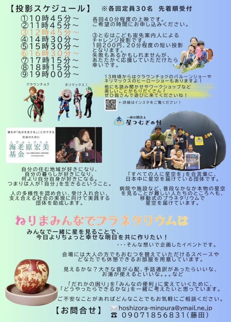 | 料金 | プラネタリウム1回500円 ※赤ちゃん~未就学児は無料 |