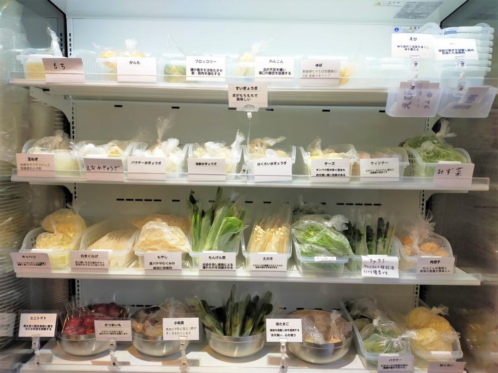 お店に入ると、カフェのような可愛らしい外観には似つかわしくない、大きな冷蔵ケースが目に飛び込んできます。中に入っている食材は様々で、旬の野菜や水餃子、珍しいものだと湯葉や白きくらげなど約30種類前後の具材がぎっしり並んでいます。(※食材はその日によって変わります)