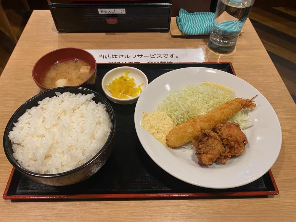 この日は唐揚げとエビフライがメインでした。エビフライはぷりぷりで口の中でとろけます。唐揚げはとても肉厚で噛んだ瞬間肉汁があふれ出てきます!タルタルソースの卵がしっかりしていたので、卵好きにもたまりません。写真のご飯は大盛で、量はなんと、二合分です!昼の時間帯は+100円で、夜は無料で追加できます。がっつり食べたい方は必見です!余談ですが、このご飯、高級店でも使用されている一等米だそうです!店長こだわりのお米をご賞味ください。