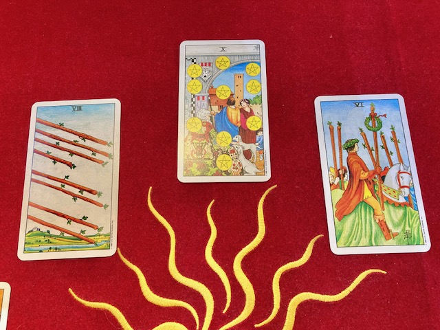ワンドの象徴は情熱や生命力で、8はワンドが勢いよく上昇気流に乗っているのを表現しています。ワンドが成長していく様相から、新しい建築物ができるとか、新しいイベントがはじまる予感がします。
