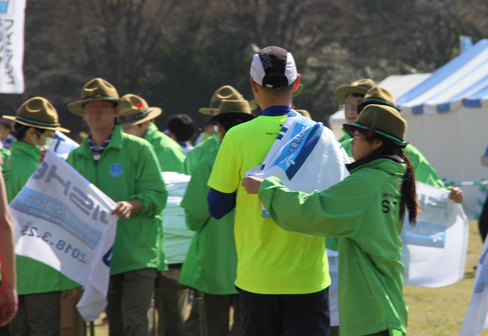 完走したランナーに記念のタオルをかけて「お疲れ様!」。みどりのジャンパーがボランティアの目印